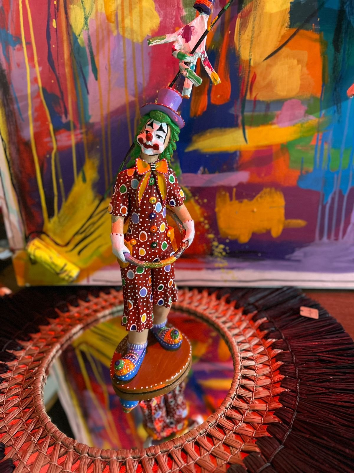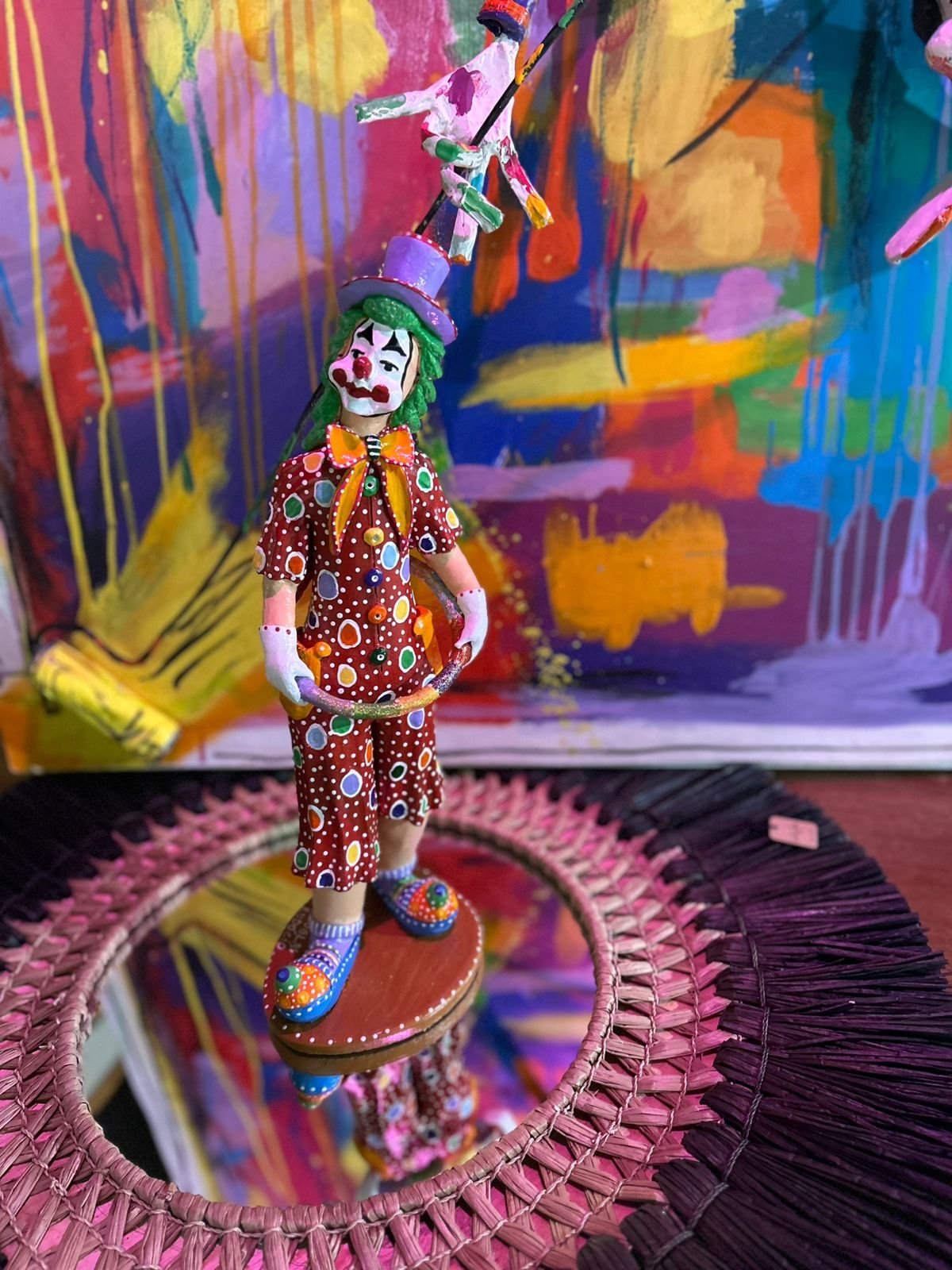 Palhaço com roupas coloridas e detalhes em alto relevo.