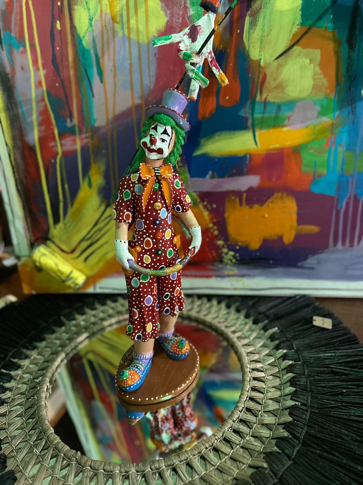 Dê um toque de alegria e originalidade ao seu ambiente com esta charmosa estátua de palhaço feita à mão. Com detalhes vibrantes e acabamento minucioso, a peça transmite leveza e diversão, tornando-se perfeita para decorar salas, estúdios, vitrines ou coleções temáticas.