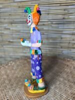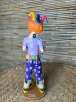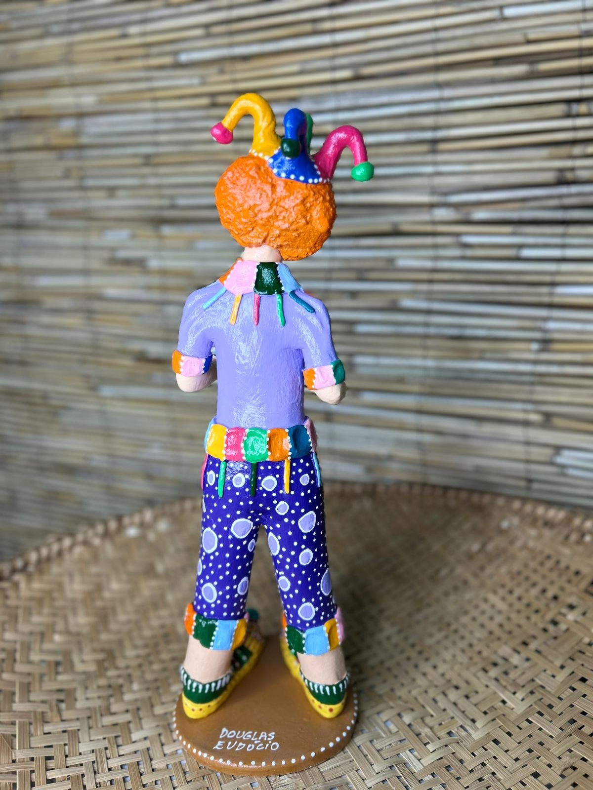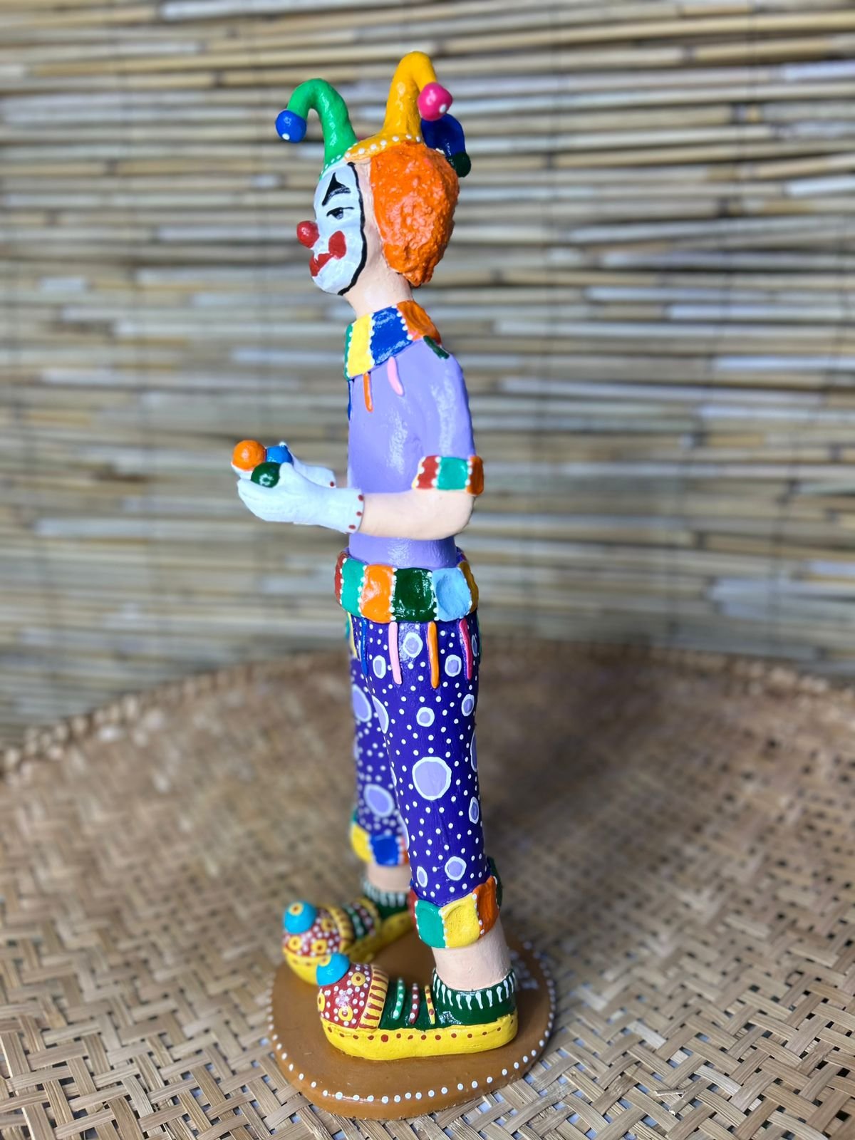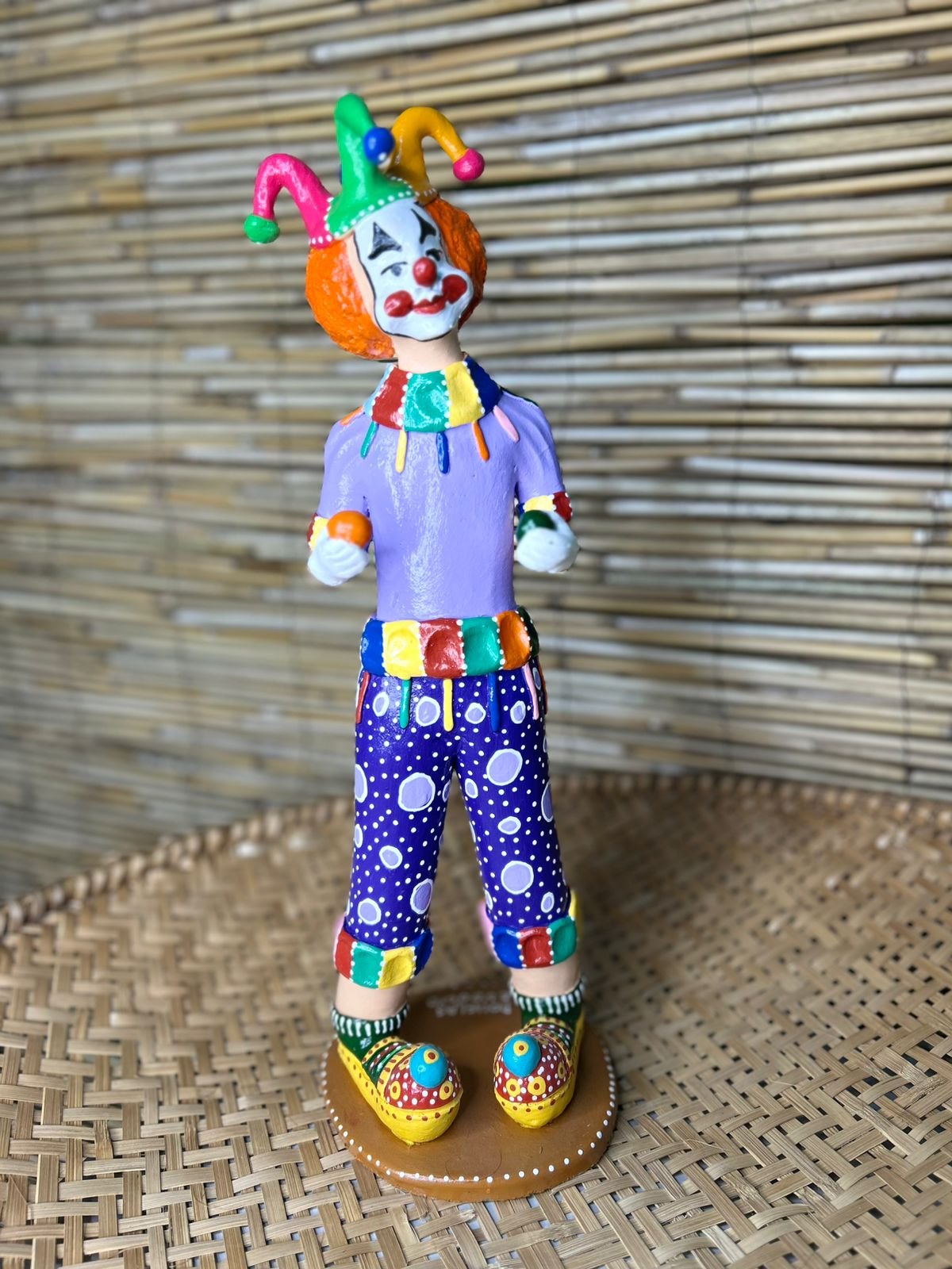 Palhaço com roupas coloridas e detalhes em alto relevo.