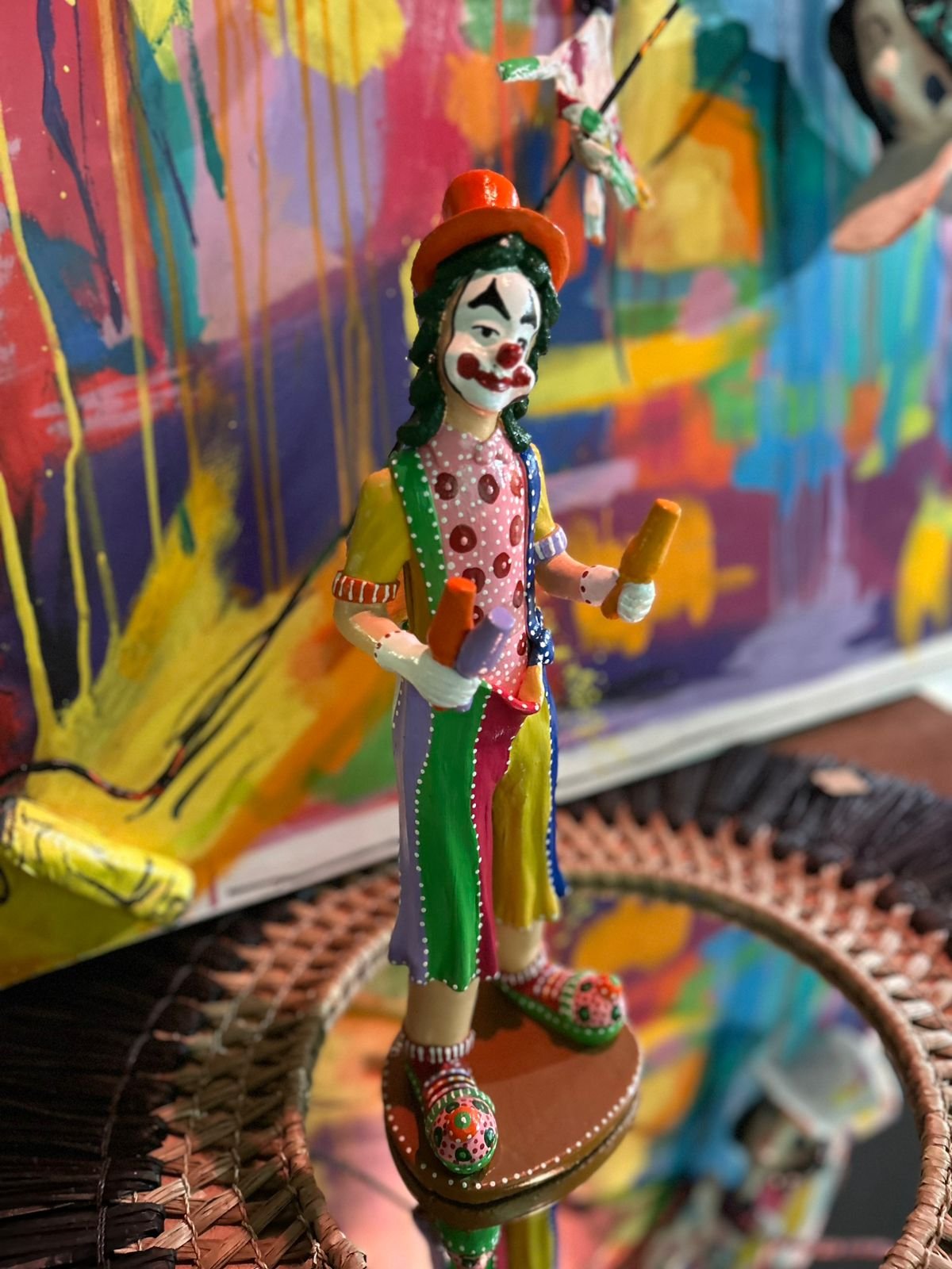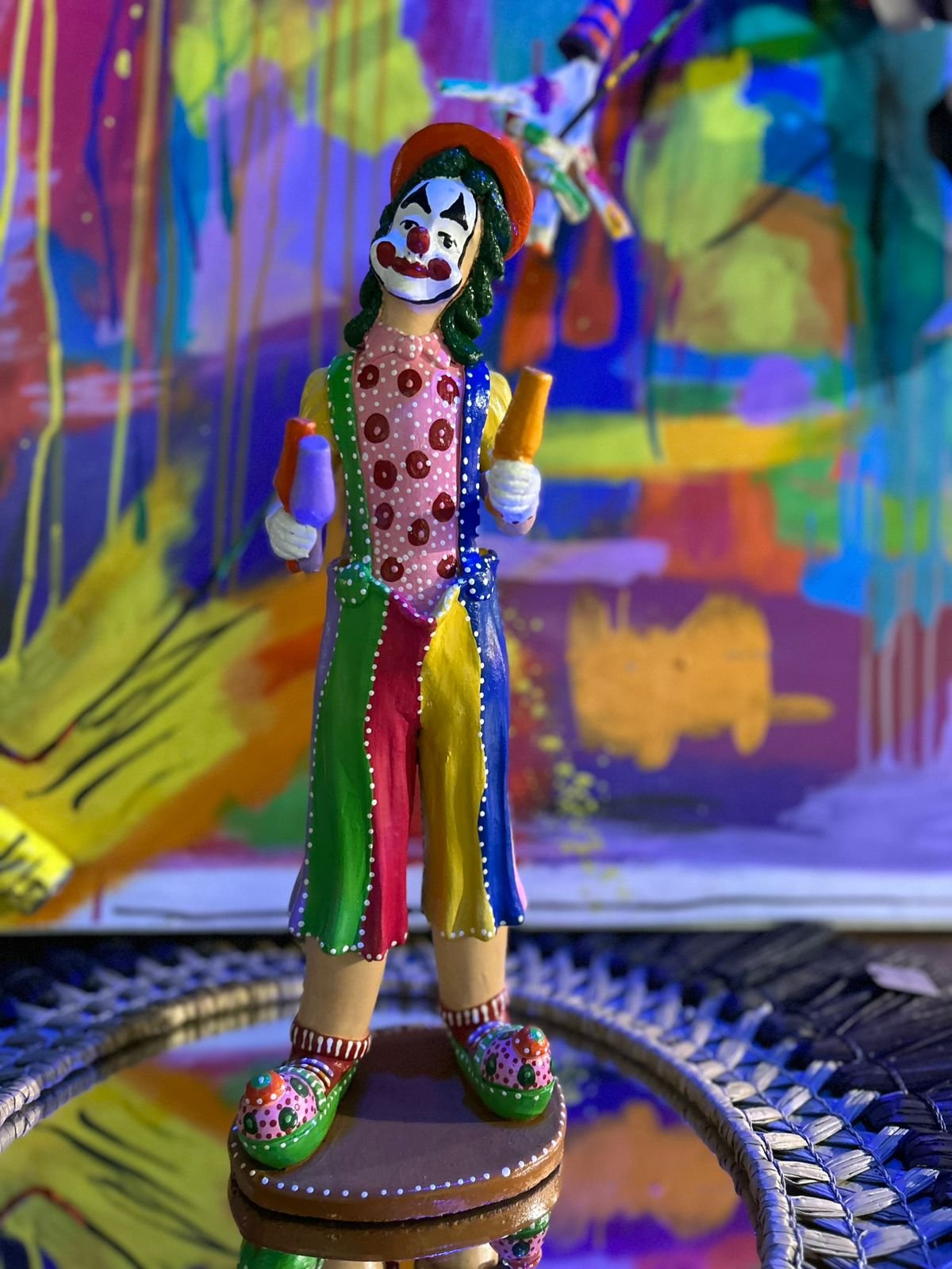 • Palhaço com roupas coloridas e detalhes em alto relevo.