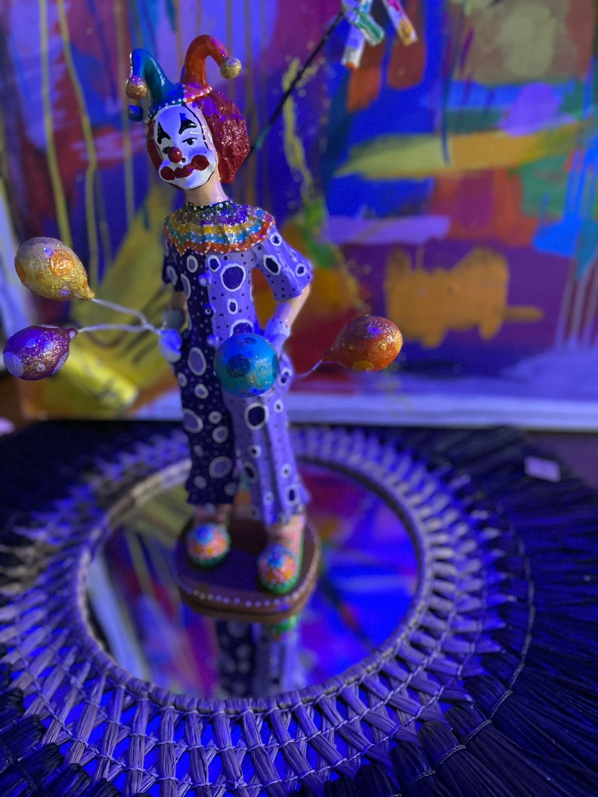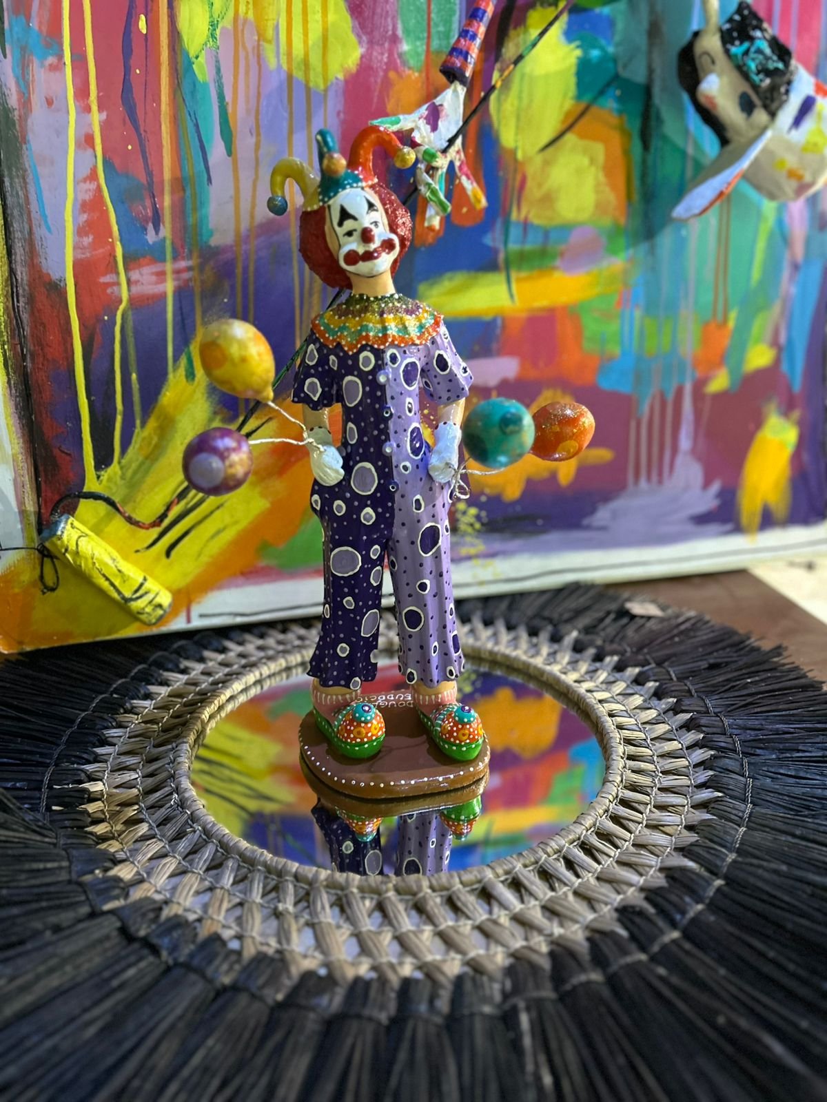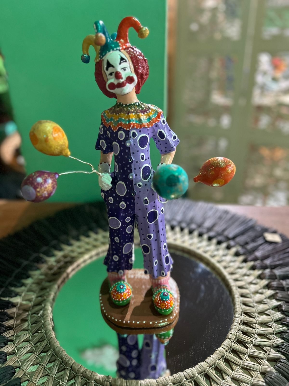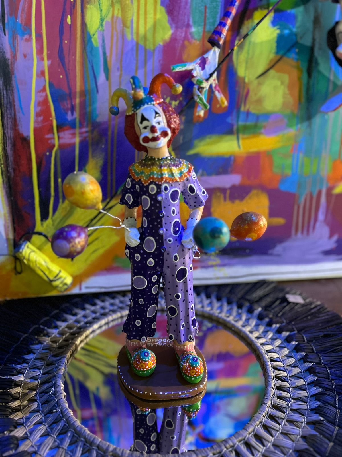 Palhaço com roupas coloridas e detalhes em alto relevo.