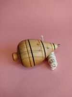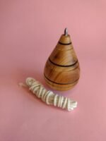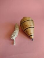 Pião em madeira com ponta metálica, acompanhado de corda para enrolar e lançar. O movimento é feito manualmente, criando um giro estável ao tocar o chão. Brinquedo tradicional que estimula coordenação, controle e habilidade.
